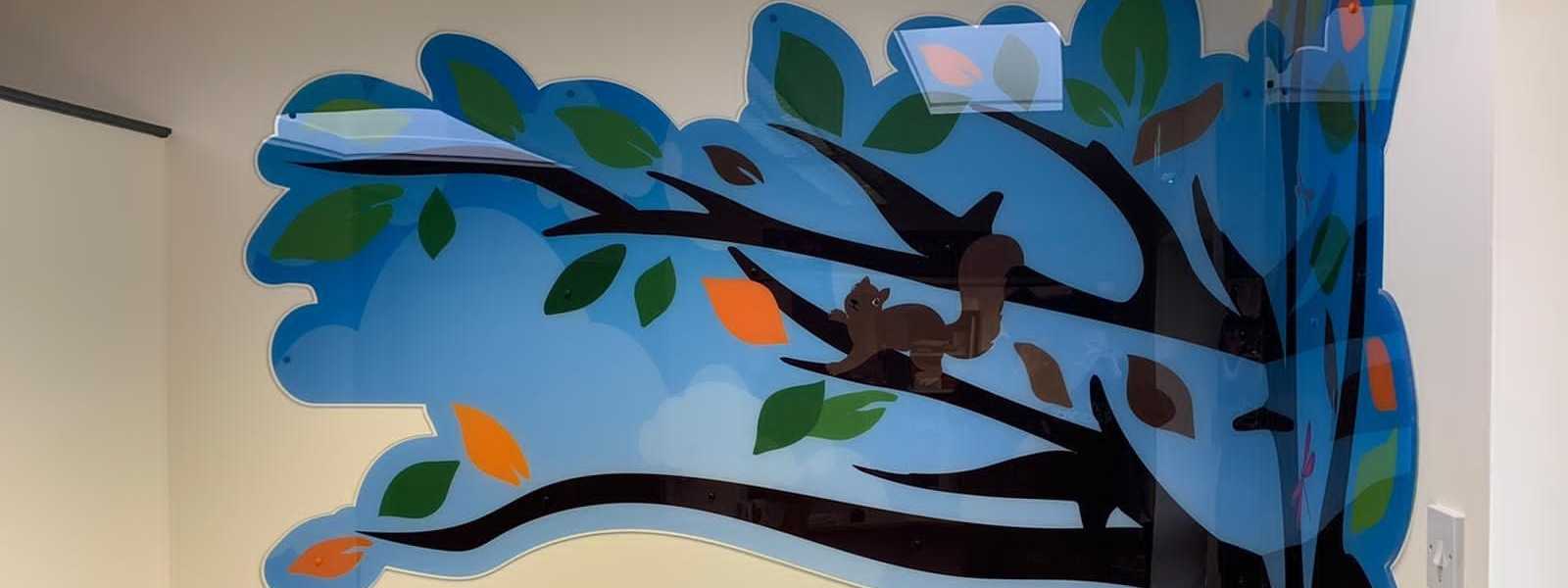 The acrylic tree was designed in-house by our studio team. The full-colour graphics were direct-printed onto the reverse of 5mm clear XT acrylic sheet. We printed the tree artwork using CMYK UV with a white pixel replacement layer. The tree itself was custom-cut to shape, so that it could fit perfectly into the desired wall space.