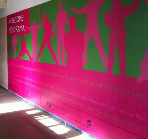 “The next project I got Creative Solutions involved in was helping us to improve a 5m long x 2m high area of the corridor that was in a terrible state. Without the funds or the time needed for getting a builder into re-plaster, we came up with the idea of covering the area. I noticed on Creative Solutions’ website that they supplied printed display wallboards for trade exhibitions and wondered whether these would work for us. In discussions with Jed at Creative Solutions it soon became apparent that it would be a perfect solution. They listened to our ideas and came back with a design that ticked all our boxes; they also installed the new surface for us too. The result was a stunning drama wall that was talked about throughout the school. Since then Creative Solutions have helped us with numerous new initiatives. This includes - stickers for the walls, artwork for the dining room including hanging information boards supporting the Government Healthy Eating campaign, signage for the corridors, School House promotion boards and collapsible banners for use at open evenings and external events. Most of our ideas come from brainstorming sessions with my team and colleagues. What I like about Creative Solutions is that we can go to them with the concept, often just drawn up in a word document, and they will work with us to bring it to reality. The response and service we always get is excellent, they provide us with quality products and if they say they can do it, they do and quickly! We have a good working relationship with Creative Solutions and we trust them”.