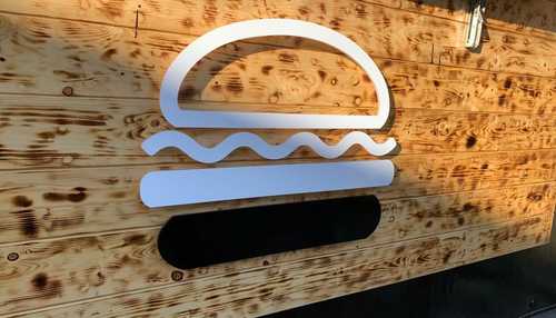 Using 10mm PVC, we created another 500mm diameter gloss white burger logo which was router-cut to shape and fixed to the wood panelling of the trailer using 16m stand-off locators, cups and glue.