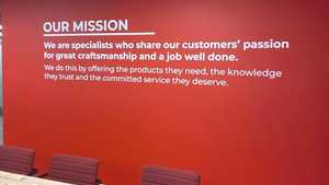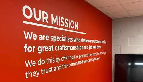 Mission Statement (Written text vinyls) - "We are specialists who share our customers' passion for great craftsmanship and a job well done. We do this by offering products they need, the knowledge they trust and the committed service they deserve."