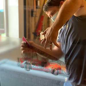 The fire engine logo was supplied as a printed gloss vinyl sticker. The image was designed without any white areas, in order to add an element of transparency—thus allowing in light and creating a sense of space.