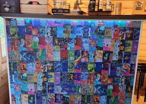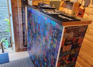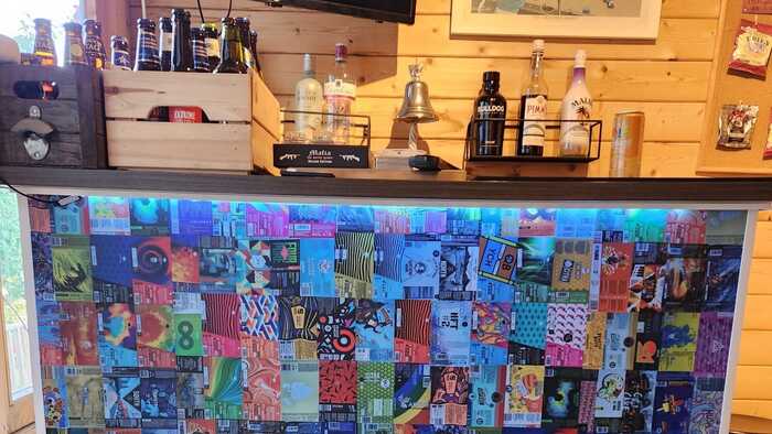 A fond lover of Craft Beers, our client chose to dress their home bar front in a brightly coloured collage of craft beer labels! Each label was carefully scanned and then laid up in a pattern for the full coverage area of the front and both sides of the bar.