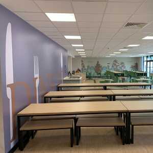 You really can turn any room into an inviting and engaging space with our custom-printed wallpaper! Holyrood opted for two feature wall installations, one closest to the cafeteria area, and another spanning the long wall at the end of the dining hall.