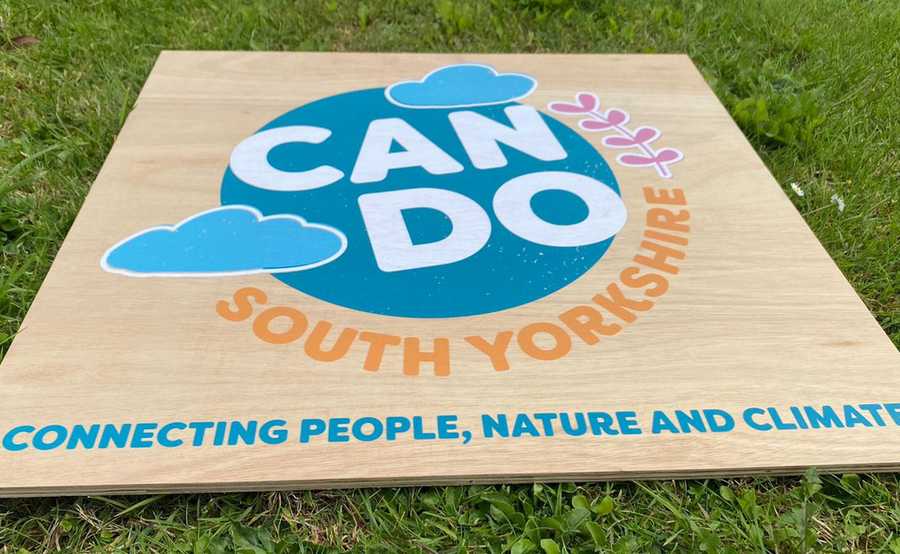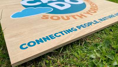 South Yorkshire Climate Alliance got in touch to produce a sign board, printed with their logo in large scale. Everything from the hardwood plywood and full-colour print needed to have the green thumbs-up of approval. Once we had their designs in-house, we set to work scaling the logo and prepping the wooden board for a direct print.