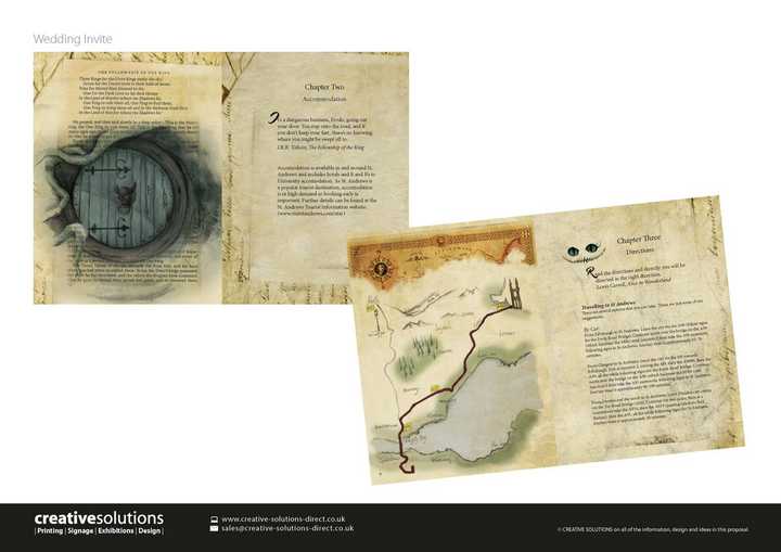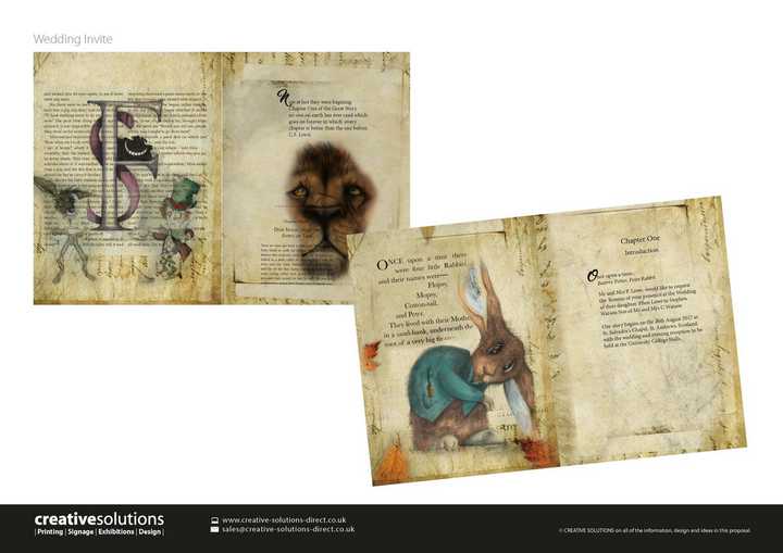 The 'storybook' style theme for the wedding invitations. Front cover (left) and inset pages (right)
