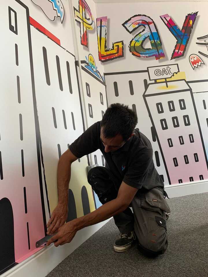 In the games area, the goal was immediate impact. A high-contrast, illustration-led mural delivers a clear visual identity for the space, with vibrant colour accents and a playful cityscape that sits naturally behind the arcade machines. The artwork was produced and fitted as a large-scale wall covering, using print methods and materials aligned with self-adhesive vinyl where required for a crisp finish and strong edge definition.