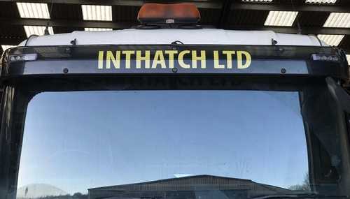 For the Scania cab, we printed a striking gold INTHATCH LTD graphic, which was cut and applied to the black panel above the front windscreen. This bold higher-case lettering really makes its mark.