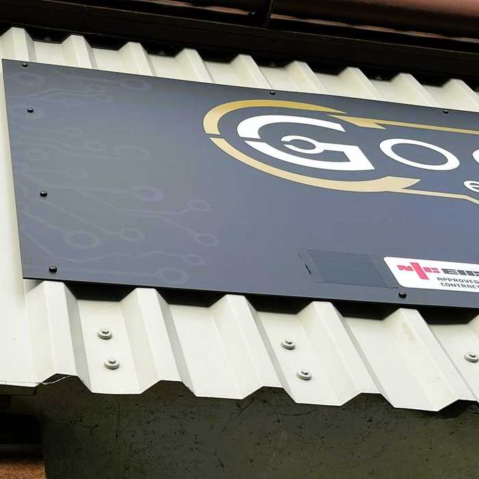 Perfectly lightweight, ACM signage can easily be fixed to prefabricated steel industrial workshops. Goodfellow Electricals new large 3meter+ sign was split into equal panels to allow for easy installation and aligned with each of the steel panels behind for multiple fixing points.