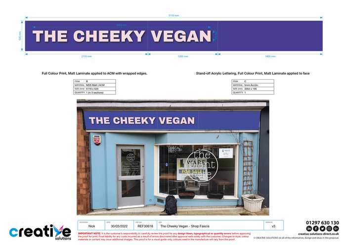 With the colouring, style, size, and font of the text set, the Design Team can create an artwork proof to show a mock-up of the final creation in its new home with images taken during the visit, see The Cheeky Vegans proof below.