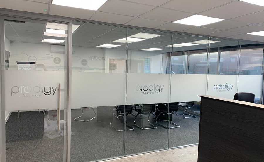 The silver etch frost effect vinyl, displaying a small Prodigy logo, was also created for the meeting room window. The vinyl was applied to the reception side of glass.