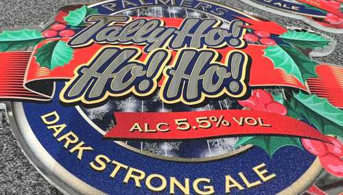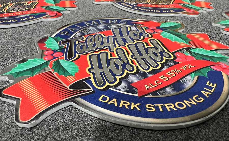 Palmers produce small batches of specialist beverages during the festive season to pair perfectly with that Sunday Carvery. The Team got in touch to commission 200 pump clips for their newest brew - TALLY HO! HO! HO! - With traditional Holly surround, and bright red and green design.