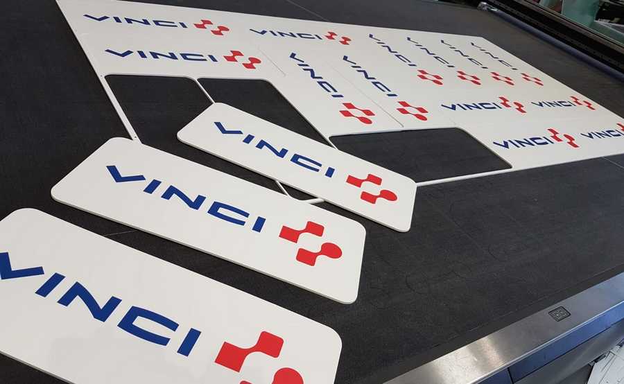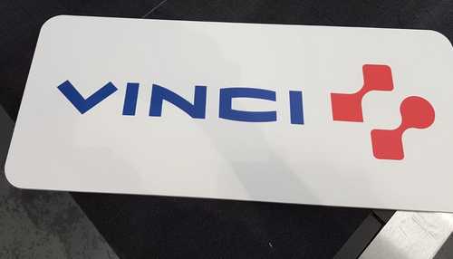 The Vinci logo, featuring a bold blue and red colour scheme, was printed directly onto the white Forex PVC board, creating a sharp, visually-impactful aesthetic.