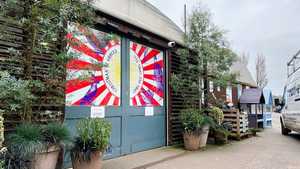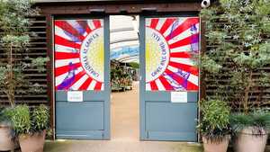 For a seasonal display that is not needed for more than 3-months, and acting as a protective measure too whilst the doors are locked, Grove's chose an opaque white film to print onto to give their design the full effect and colour vibrancy. This was printed in reverse to be applied to the inside of the glass panels of each door for added protection against the elements. Through the open doors you can see the previously installed Vinyl Archway Covering to add a touch of brightness to the polytunnel entrance.