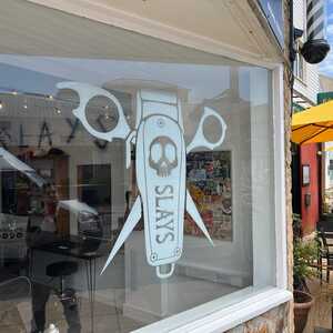 These can be digitally printed in full-colour for vibrant installations, or single-colour cut-vinyl creations. There is almost no limit to the uses of printed window film. You can also have multiple colours and types of window vinyl layered to create stunning effects. For Slays, Chris opted for an opaque single-colour cut vinyl creation, applied to the inside of the glass. Our window graphics vinyl has a strong adhesive that will leave minimal residue when removed. It is UV-resistant to fade and laminated for extra protection, it is also heat-resistant, meaning as the glass heats and cools throughout the day and year, the vinyl can adapt to these changes making it incredibly long-lasting.