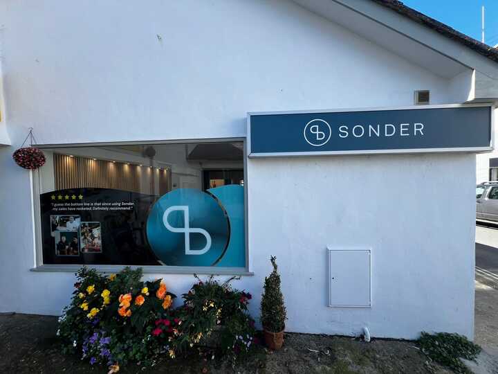 To support the fascia and give the frontage more depth, the glazing was treated as a second layer of communication. Branded window stickers & graphics were used to balance bold visual impact (large brand shapes that make the unit instantly recognisable) with structured service information, so people can understand what Sonder does without needing to step inside. This kind of layout also helps the space feel considered from both sides of the glass – confident externally, professional internally.