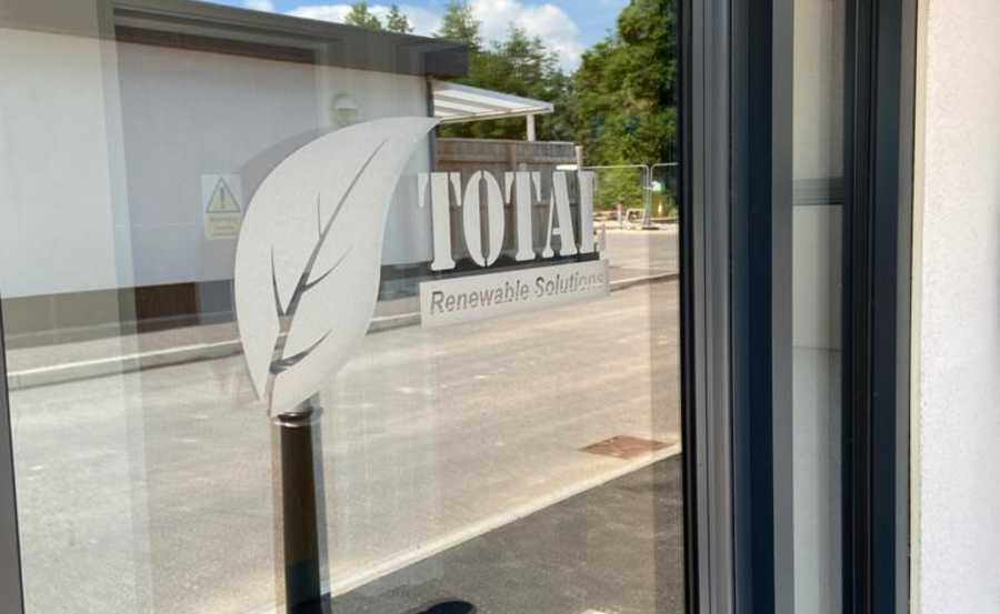 As well as two additional full-colour printed forex 3mm board signs, we also supplied a frost-effect vinyl decal for the main door windows. The vinyl would feature the Total Renewable Solutions company logo with a stylish etched finish. Window frosting can be a superb branding opportunity for a business premises; it’s a subtle yet effective method of projecting your company name and catching the eye of your customers. The TRS vinyl logo was applied in a large peel back sheet. As the vinyl is tacked, our installation team checked the integrity, removed any air pockets, and ensured that all the edges were flat and fully adhered. The result: a stunning branded window display!
