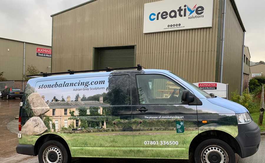 Once Creative Solutions had been supplied with photographs of Adrian’s artwork, installed in some stunning natural settings, our design studio created the vehicle wrap for the VW Transporter. The optics were vital for this project—in that Adrian’s artwork needed to be captured in all its glory—so we strongly recommended printing in full colour, using 8-10 colour inks, at 2880dpi. This is our highest photographic print quality. We firmly believe the results speak for themselves.