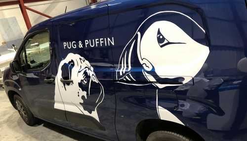 Martin and Jenny from Pug and Puffin contacted us about creating some signage for one of their blue Volkswagen delivery vans. They would provide us with the company logo, the eponymous dog and bird, from which we would trace and create vector files for production.