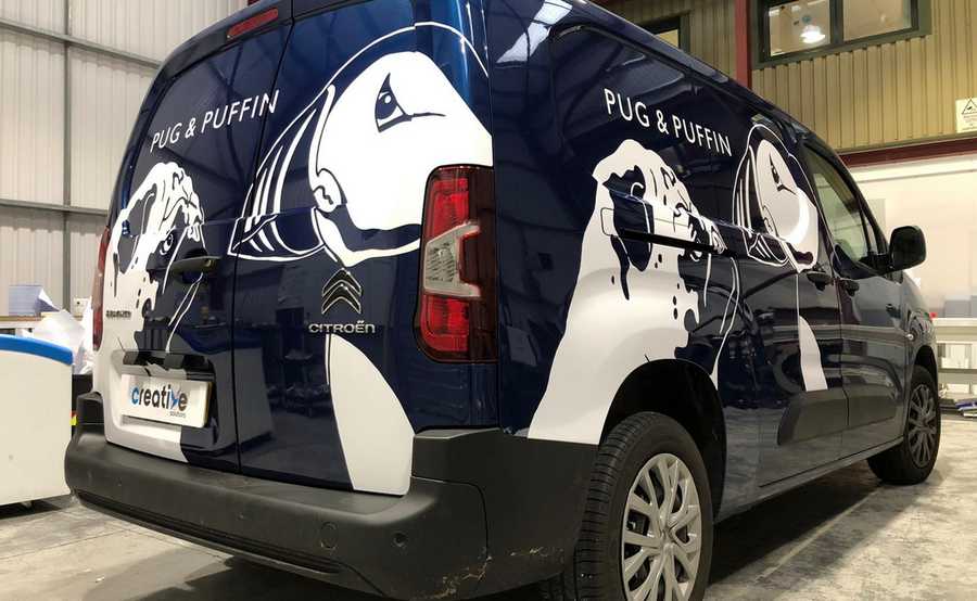 Our team at Creative Solutions created three separate cut-vinyl graphics for the company vehicle; for both side panels and the VW van’s rear. The design in each case was the same: the image of the pug and puffin, with the company’s distinct stylized name above it.