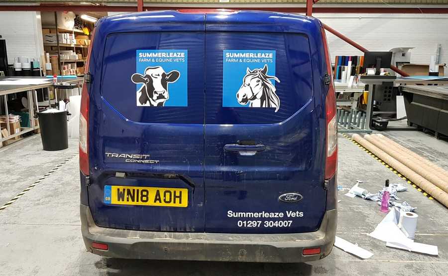 As always for a project such as this, we sent the client a digital preview of the graphics for them to approve. The familiar cow and horse logos were then cut to shape and printed in full colour and gloss laminated. They consisted of 6 images in total—2 were adhered to each of the side panels of the Kangoo and 2 to the back. The Summerleaze contact details were also printed on the side panels and rear; the client chose vinyl with a gloss white finish, which really stands out on the dark blue tone of the van. Overall, a successful project and a client we hope to work with again soon.