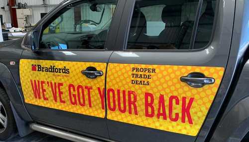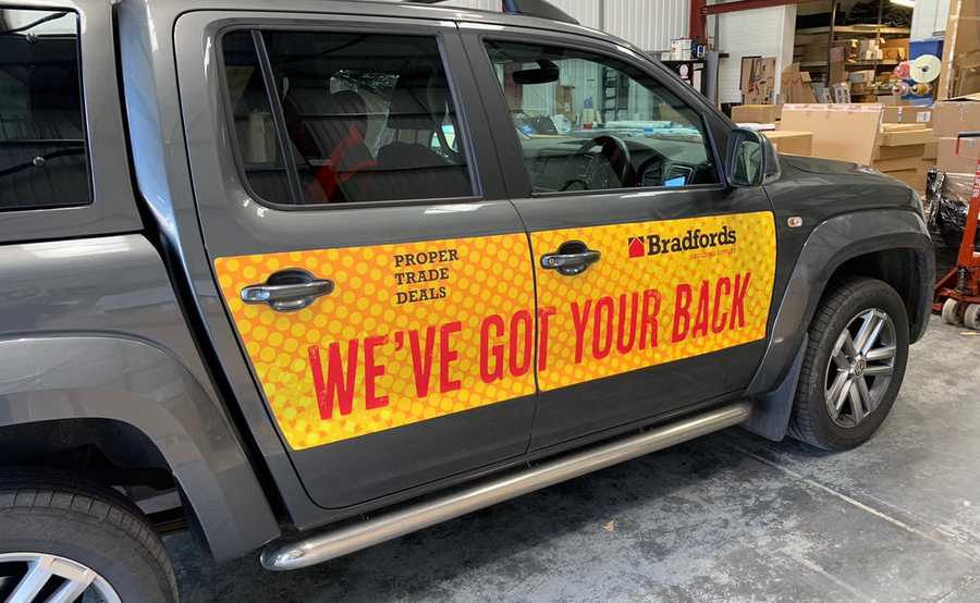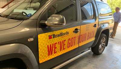 The Bradfords ‘We’ve Got Your Back’ vehicle graphics were printed onto 1.1mm thick magnetic sheets in full-colour with a matte laminate finish. A hard copy template was created to fit the shape of the panels and the areas around the door panels. Once this stage was complete, the removable sheets were applied in-house to the side doors and tailgate of the Volkswagen Amarok pickup truck.