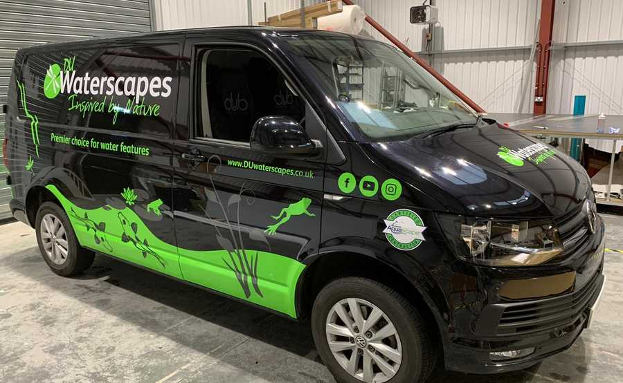DU Waterscapes came initially to the Creative Solutions Studio for a logo redesign. our designers set about planning the vehicle livery. In the creation of the client's new logo our studio already had some design ideas in mind that could be utilised for the vehicle and match in perfectly with the brand assets. The vehicle in question was their company van, a Black VW Transporter Panel Van.