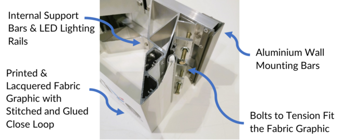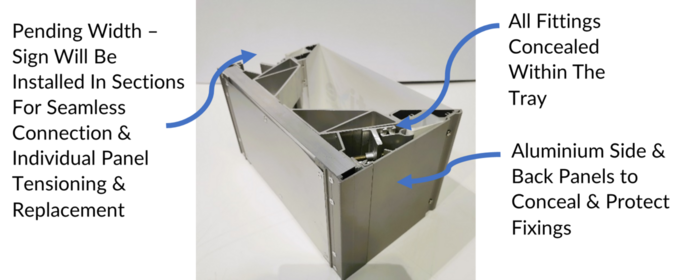 The undeniable winner of the most popular type of illuminated sign, is the humble Illuminated Tray Sign. Imagine the lid of a biscuit tin, made of high grade aluminium, the LED curtains are then expertly fitted within the tray for edge to edge lighting capability, and a 'skin' or graphic with your design is stretch and held over the tray. The fitting rails are then mounted onto your chosen wall, and the tray fitted over them, creating a seamless and floating appearance with no trailing wires, fittings or support fixtures on display. Once mounted and a professional electrician has wired in your sign, its time for lights on!