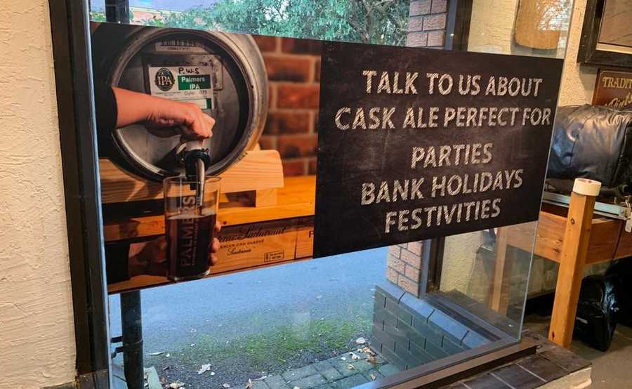 For the internal windows, the graphics are equally uncluttered and clear. Beautifully printed bold white lettering, with a slight textured effect, on a chalkboard black background. For the graphics advertising cask ales, we included a high-definition image of a local IPA barrel for an extra visual dimension.