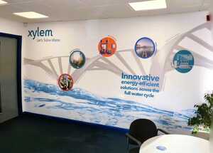 As you enter the main lobby you are greeted by these exceptional printed wallpaper creations. The first (see left) allows you to easily see Xylem's vision and values and the breadth of their engineering works with full colour, crisp photography recreations coupled with clear text areas.