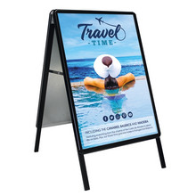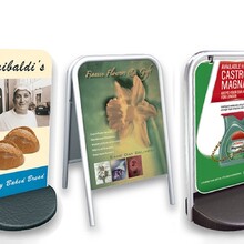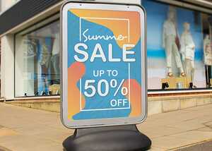 Outdoor pavement signs and A-boards are crucial for retail premises and shops. They act as a draw to customers to show them special offers or give information. Because of their reduced dimensions, these signs are designed to fit onto smaller walkways, and be more portable. Swing signs are made to be semi-permanent, whereas the A-board is designed to be folded flat and for example be carried in and out of the shop each day. These retail pavement signs are available with permanent graphics that have a minimum 5 year life span, or can be fitted with the ability to change posters either with a snap frame or magnetic sealing unit.
